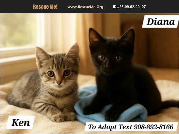 URGENT RESCUE KITTENS! To ADOPT please TEXT MESSAGE 908-892-8166 Kensington (male) and Diana (female) are siblings and they can be adopted separately or together! They are spayed/neutered and vaccinated! Take them home Today!