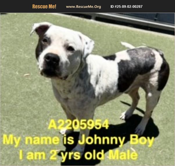 Urgent update!!!! He is now scheduled to be killed on 10/4 for space!!!! Johnny boy has been added to the urgent list not because he's a bad dog, but because of the severe shelter overpopulation!!! So he's in jeopardy because of space??!!!! JOHNNY BOY, A2205954 - NEUTERED MALE, WHITE AMERICAN BULLDOG. Shelter: SOUTH L.A. Age: 2 YEARS, 72.00 lbs. This animal has been at the shelter since 06/26/2025 and on this list since 08/30/2025. Urgent Listing Reason: Urgent alert 8/30/25 Shelter dog population is at 307, and we are beyond our max capacity. This dog is being urgent alerted for space at this time!!! Catherine Lee Lifesaving Liaison/Foster Coordinator Animal Care Technician Los Angeles Animal Services South L.A./Chesterfield Square Shelter 1850 W. 60th St. Los Angeles, CA 90047 E: [email protected]