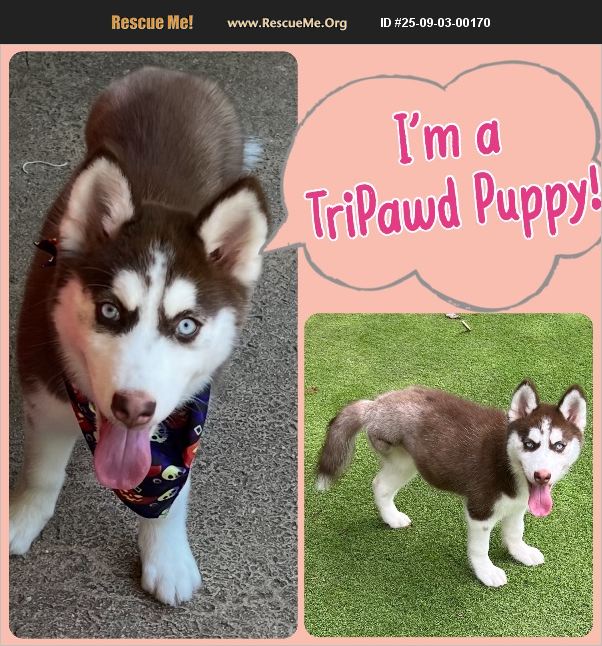 Meet Aurora, a gentle and friendly tri-pawed girl who will melt your heart! This sweet baby is a playful and curious soul, always up for an adventure, yet she has a calm and quiet side, too. Aurora is a brave little warrior who has overcome injuries and surgery, and now she's ready to find her forever family. She is crate-trained and almost house-trained, and gets along with people and other dogs alike. With her gentle spirit and loving nature, Aurora is sure to bring joy and love to her new family. Could you be the one to give this special girl the home she deserves? Please see her story here- We're still collecting donations to help fund her surgery and care. https://www.zeffy.com/en-US/donation-form/help-us-save-auroras-leg Aurora Husky female Tripawed- right rear leg was removed due to injuries. Birthday 07/01/25 Adoption fee $650.00 Please complete an adoption application at https://form.jotform.com/202126352339045 Applications are evaluated in the order received. Adoption fees help fund the veterinary and daily care of our other animals in need. *IF adoption fee includes spay and neuter- cryptorchid