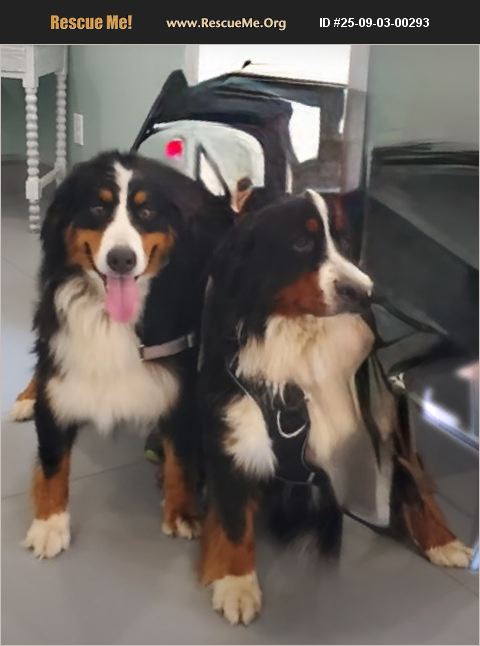Bella and Rocky are two purebred Berners that were found at an animal shelter . They are litter mates. Rocky tends to be more submissive and likes to go where you go. Bella tends to be more independent. She loves to hang outdoors. They both are working on training and can walk on a leash. They need a home with a fenced in yard and a calm environment. They are both very sweet and adjusting to home life. They are bonded pair and sleep and play together .