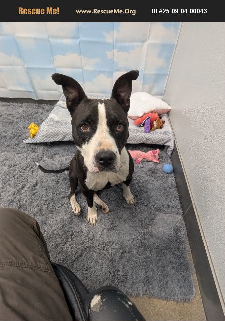 Scout 8 years old male. This handsome black-and-white gentleman is a neutered Staffordshire mix with the sweetest personality. First Impression: Scout is quiet, polite, and well-mannered. He keeps a clean space and has a naturally friendly vibe. What Makes Him Happy: Praise, tasty treats, fun toys, and exploring with his nose! ��%90� How He Handles Shelter Life: Even in the busy kennel runs, Scout stays calm and collected. He doesn't react to other dogs walking by and is easy to leash and guide outside, and he is friendly and playful with other dogs. In a Quiet Room: Scout shows his soft side with a loose, waggy tail. He'll happily sit for treats, entertain himself with plush toys, and enjoys cozying up on a dog bed after playtime. On Walks: He loves sniffing, stretching his legs, and politely doing his business outdoors. Energy Level: Low to Medium - the perfect balance of play and relaxation. A Note: Scout can be a little overwhelmed with vet handling, but with patience and gentle reassurance, he'll continue building confidence. Scout is ready for a home that appreciates his calm spirit, goofy toy-play, and loving nature.