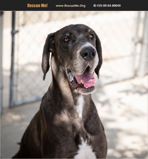 This animal is available to licensed rescue groups only. Please do not enquire unless with a licensed rescue group. Astro is not yet neutered - any rescue organization will need to commit to neutering him prior to adoption. There are no fees to pull from the shelter. This gentle giant is Astro, a 3-year-old Great Dane with a big heart and an even bigger presence. He was surrendered by his family who, with a baby on the way, decided they no longer had the time he deserves. Astro is a friendly, well-behaved boy who does well with other dogs and has no history of anxiety. He barks to let you know he's there, but he stays safely in a fenced yard and doesn't dig. He's still a playful pup at heart - especially when it comes to soft toys (which don't always survive playtime!). Astro hasn't been tested with cats, but he's been a sweet companion to humans and dogs alike. At just 3 years old, he's past the puppy phase but still has that youthful energy and charm that makes Great Danes such loyal, loving companions. He's ready for his forever home - one with room for his big paws and even bigger heart.