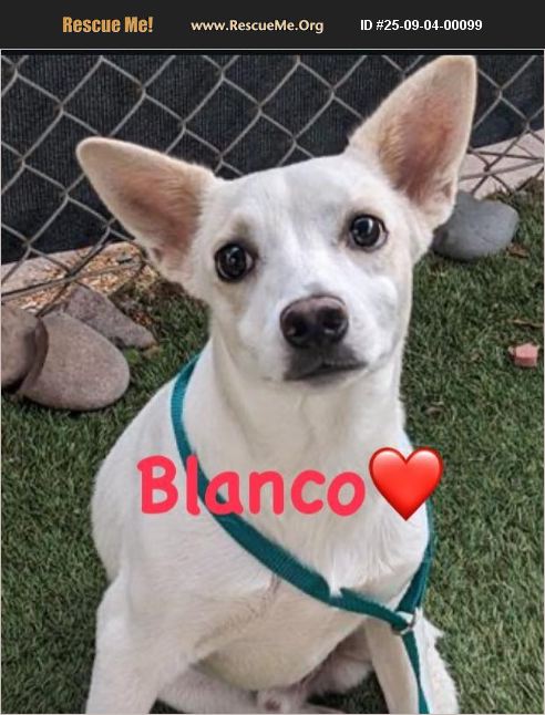 Please help me live! The shelter has given me a deadline I have done nothing wrong so I hope you can commit to FOSTER me before my deadline! Located in Phoenix Arizona Please apply here Call or text 602-834-4911 or submit app Dogfoster.org He is a 10 month old white Chihuahua mix weighing 25lbs. Blanco is the sweetest little puppy. He was found as a stray and stayed with him family for 2 months. He is great with kids, people, dogs, and cats. He is sweet, affectionate, and loves attention. He listens well and wants to be front and center in your world. He is just a playful puppy looking for guidance and love. He is very confused why his family abandoned him at the shelter. Once Blanco got over being scared at the shelter, he has been nothing but a sweet and friendly puppy. Please foster Blanco and help him receive the love and patience he deserves!