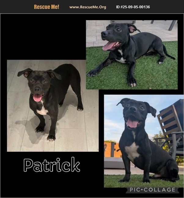 Patrick! He is 1 year old, 29 lbs, looks like a staffy/wiener dog mix! He's leash, potty and crate trained. Neutered and current on vaccines. He is so friendly and chill!