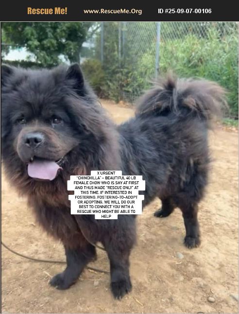 Courtesy Posting: X URGENT -SACRAMENTO, CA (N CAL)- Sacramento County Bradshaw Shelter ID #A899895 'CHINCHILLA' - BEAUTIFUL 40 LB FEMALE CHOW WHO IS SHY AT FIRST AND THUS MADE 'RESCUE ONLY' AT THIS TIME, IF INTERESTED IN ADOPTING, we will do our best to connect you with a rescue who might be able to help. SHELTER ASKING FOR HELP, MAY BE EUTHANIZED IF NO FOSTER/RESCUE STEPS UP. RESCUES NEED FOSTERS- CA ANYONE HELP? CHOW OR SIMILAR BREED EXPERIENCE REQUESTED. We are in urgent need of finding a chow savvy foster or foster to adopt, as well as rescue for this pretty, petite girl who ended up at the county kill shelter as a neglected stray with a coat in need of grooming. Fondly named Chinchilla by the shelter, she is estimated to be 5 years young and has no reported or mentioned medical issues. At 40 lbs, she is also perfectly sized. Not surprising, the shelter said, she 'Came in very shy with people but sweet and is now coming around. She has also participated in shelter play groups.' In fact, we have several videos showing her doing well with both large and small dogs, as well as enjoying being pet. Additionally, volunteer notes state, 'She Keeps her kennel clean and was anxious to get outside and potty, pottied a bunch outside (showing signs of being housebroken). Fearful at leash up but walked nicely on leash. Mostly keeps distance in the yard but occasionally approaches and let me scratch under chin a couple times' However, despite this, the shelter has yet to make her adoptable, and she remains in Rescue only status, meaning only a rescue group can save her. Rescue groups need fosters, or someone interested to foster to adopt. She cannot be adopted directly from the shelter at this time. although we are happy to request for you. Chinchilla's listing link is: https://24Petconnect.com/DetailsMain/SACC/A899895 Play Group Video: https://www.youtube.com/shorts/wXvrPS-2HMo Video with people: https://www.facebook.com/reel/1304152251121012 Chinchilla has now been at this high intake shelter since 8/19 and may be placed on a deadline soon in a full shelter. Therefore, if you are chow or similar breed savvy, and can foster or foster to adopt, please contact [email protected] asap or Southern California Chow Chow Rescue Network who is trying to find placement asap, and can try to pair fosters or interested parties with a willing rescue group. Ideally, we need a foster near the shelter or in N Cal. Listing link is posted in comments. Shelter has offered to spay, vaccinate, microchip and heartworm test at No cost to a rescue. Some Transport to a rescue can also likely be arranged. Rescue groups may contact the shelter directly by phone or emailing the rescue coordinator at (916) 875-7982, or Cell (916)980-9714, ask for Sara, or Tara, (916) 875-7982 or Cell (916) 980-9107. Please also email: [email protected] We will post additional pictures, videos and updates for this dear little girl on facebook at: https://www.facebook.com/debbie.alder.14/posts/pfbid02HzhfA7nRoYksTJQzVhujk1tUfeCgmZoXN5XeppCyxEqvT8WLPmQuAovaUFQrxqrWl Note: to view contents of links you will need to copy and paste each one separately into your browser.
