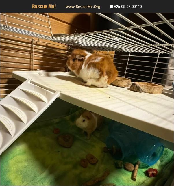 Two male guinea pigs to go to a new home together. They will come with all you need to care for them - large, 2-level home, 2 water dispensers, food dishes, clippers, brushes, 2 liners, chew toys, any pellets, hay and treats we have left at time of adoption - everything!