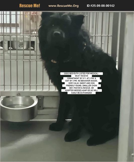 Courtesy Posting: CODE RED/EUTH LISTED FOR MEDICAL- MUST RECEIVE COMMITMENT BY 9/11 at 2 pm, and exit by 3 pm. No behavior issues, very calm, sweet and dog friendly young, smaller chow boy. Foster and rescue, or adopter needed asap or he will sadly be euthanized. Please see videos we have posted on Facebook. DOWNEY, CA- SEAACA KILL SHELTER-ID #26-02073 - STUNNING 44 LB MALE LISTED AS A 2 YR CHOW X, LOOKS MORE PUREBRED. NOW ON THE EUTH LIST - NEEDS LOVING, RESPONSIBLE HOME, OR FOSTER AND RESCUE ASAP Please help us find a loving, forever home (or foster and rescue) for this very handsome and very sweet boy who is estimated to be only 2 years old and is a smaller chow. His shelter picture does not do him justice, must see him in videos. A Shelter volunteer who met him and provided videos described him as 'the best chow ever, docile, loving' and further added, he was submissive to the hyperactive large dog he is kenneled with and was jumping all over him, which is seen in several videos. The shelter notes also state he was 'able to pet and handle'. No behavior issues are noted. We are calling him 'Charlie' and the shelter sent out a plea for help because he is ill with possible kennel cough (has clear nasal discharge but a dry hacking cough), and has been placed on meds. He is also noted as having possible lower lid entropion and missing some fur on his legs, as well as had some diarrhea, possibly from stress. Please note Charlie only came in on 8/27 as a stray and was been added to the euth list on 9/5 with a 9/11 at 3 pm deadline to exit, 2 pm to commit. The shelter has already stated no extensions will be granted. Due to his medical needs, we are looking for a foster we can refer to as rescue to save him in time, as most rescues need a place for a dog to go. A rescue could then provide medical needed. We are unclear if he can also be adopted directly from the shelter with a medical waiver, but we can also refer potential adopters to a rescue group to help to foster to adopt and assist with medical if needed, or if he is made Rescue only (and only allowed to be released to a rescue group). For direct adoption inquiries and adoption holds, please contact the shelter asap using his listing link: https://seaaca.org/adoptions/view-our-animals?breed=Chow+Mix&pet_id=26-02073 or by calling (562) 803-3301 and providing the his ID. If Charlie is not already neutered, this will be done for an adopter once he is healthy. As Charlie likely needs rescue though, please contact [email protected] or Southern California Chow Chow Rescue Network asap who is trying to assist with his placement, particularly if you are interested in fostering or fostering to adopt- so we can try to pair you with a willing rescue to help with medical etc. Rescues should call (562) 803-3301 x258 and email [email protected] We will post videos, additional pictures and any updates on the Facebook post here: https://www.facebook.com/debbie.alder.14/posts/pfbid0hsNsCxy62jQGWAAs97krHcY5NcSpXF1pnSrCbjjnpuEVsaHgtjReuj5Yv6PwYeCKl NOTE: to view contents of links you will need to copy and paste each one separately into your browser.