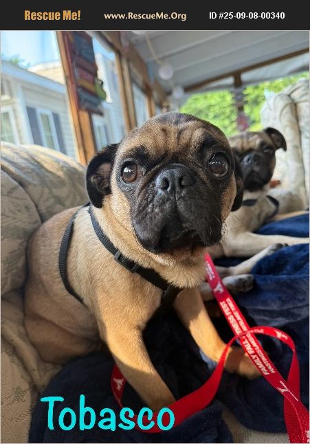 Tobasco, 10 month old Purebred Pug sibling to Chalula who needs a home would like them to go together but will separate. Please note fenced yard and friendly playful dog MANDATORY. Very, very sweet and loving, working on Housebreaking and will be fully Vetted this Wednesday, August 13th and ready to go to a Forever Home. Good with other Dogs. Located in Delavam, WI. Approved Application & Adoption Fee required. Please contact Diane Ponzo: [email protected] if interested in Adopting. Can also complete On-Line Application at www.tinypawssmalldogrescue.org. Will be Neutered.