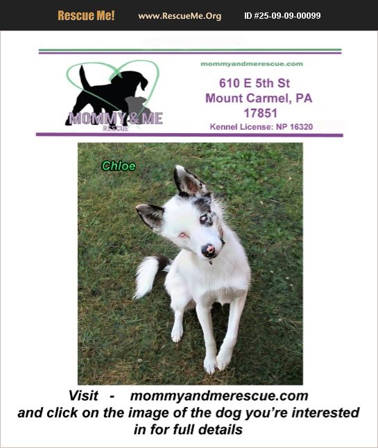 Please fill out an application here ) https://mommyandmerescue.com/adoption-application/ and give your vet clinic permission to speak with us. Spayed/Neutered, UTD on vaccines, Chipped Adoption fee 400 You must submit the application and be approved prior to meeting one of our dogs. Please add our EMAIL to your contacts! [email protected] Kennel License: NP 16320 Chloe Female Pomsky 9 months old Weight: 19 pounds Chloe is an amazing little girl with a wonderful personality. She was surrendered by her breeder because she is blind. Chloe doesn't know that she is blind and doesn't let it get in her way. Her sense of smell and hearing are so good that people have trouble believing she can't see. She is about knee high. Chloe loves people and other dogs. Her favorite activities include: digging holes, eating flowers, playing with other dogs, people, toys, being held or carried, eating, chasing birds and sleeping on her person's lap (all in that order.) She loves belly rubs too. Chloe was trained at FIDOS SCI Coal Township and knows the following: Leave it Sit Down Come Off Crate-trained House-trained Leash-Trained