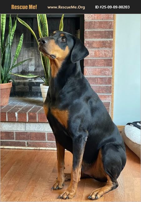 Captain is a 6-year-old neutered male Doberman with a heart of gold. He's the kind of dog who wins you over in seconds-the moment you look at him, his tail is wagging and he's beaming his signature Doberman smile (so big he sneezes sometimes!). Captain adores kids and is endlessly gentle, patient, and loyal. He's house trained, knows the 'go to bed' command, and settles down well once he's given a comfy spot. He enjoys visitors, is used to an active home, and is always happiest when people are around. While he loves playtime (chasing a laser light is his absolute favorite game), he also has a lazy, snuggly side and will happily curl up for downtime. Captain does have separation anxiety when left alone. He will cry and pace while alone at home. Captain would do best in a home with space to run, daily activity, and plenty of love and attention. He's an affectionate, devoted companion who will become your shadow and best friend in no time.