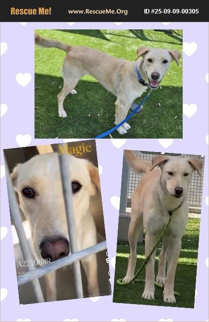 Magic #A2210888 pretty girl!!! Video: https://fb.watch/C0px38ADCk/?mibextid=wwXIfr&fs=e 3 year old 54 lb spayed female. Beautiful and if I were to guess I'd say Labrador retriever / Shepard mix. She walks nicely on the leash checking in. Shes warming up in the scary shelter but still a little shy. Like fetch and treats. A little patience and time to decompress will be great for her once adopted. The shelter is open Tuesday-Friday 8am-5pm and Saturday & Sundays 11am-5pm. Mondays for emergencies only. SLA / Chesterfield Square Animal Shelter 1850 W. 60th Street, Los Angeles, CA 90047 1-323-565-2161 or Bonnie 818-430-5959
