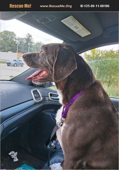 Sweet 3.5 yr old chocolate lab, Dixie. Owner just passed away. Female, housebroken, spayed, vaccinated and microchipped. Great with everyone and everything except other dogs. Must be the only dog in the home. Low activity level. Quiet baby, doesn't bark. Super sweet and affectionate just wants to cuddle and be loved. She comes with everything. Call or text 586-930-2021.
