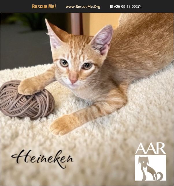 Heineken is a feisty, fun, little golden kitten He has a lot of energy and likes to play and climb. Heineken got along with the other kitten at his foster home. He would love a house with stairs so he could run up and down and play hide and seek on them! If you need some excitement in your life, come meet Heineken!