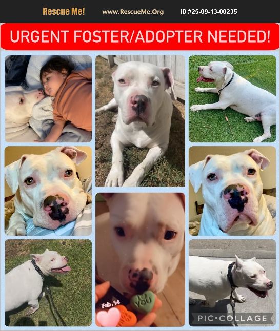 URGENT! Video included. Jack Frost Needs a Foster or Adopter ASAP! Jack Frost is a 6-year-old white pitbull whose whole world has just been turned upside down. His mom has loved him since he was just 8 weeks old, but after hitting hard times, she and Jack are now living in her car. Jack is her best friend and lifeline. She has a job, but she can't leave Jack in the car while she works. She's done everything she can�'�|leaving him with friends and relatives while she worked�'�|but has run out of options. The only place left is the shelter, where overcrowding means Jack will almost certainly not make it out alive. His mom's life is already hard enough without the crushing fear of knowing that her best friend didn't make it out alive. That's where Pumpkin Pawz Rescue wants to step in and help this little family. But we need YOU. About Jack Frost: 6 years old. Neutered & up to date on vaccines. Housebroken & mellow. Loves children and people �%9D%A4��%8FNeeds to be the only dog in the home. Snuggly, loves walks & watching TV. Big fan of pup cups from Starbucks. Jack is sweet, mellow and just wants to love and be loved. If you can foster, adopt, or know someone who can, please reach out to Jennifer at Pumpkin Pawz Rescue: +1 (714) 366-8170 If you can't take Jack yourself, please share his story far and wide. The right person is out there�'�|help us find them before it's too late.