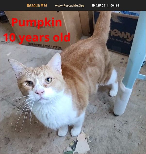 Pumpkin is a stunning 10 year old orange and white tabby male that weighs 13 lbs. Pumpkin came to the rescue from a hoarder that had 17 cats and was unable to care for them and himself. Someone stepped in to help him and the rescue took the cats. He loves pets and snuggles and will rub all over your legs. This sweet boy is calm and quite but loves to be with his people. He is litter box trained, good with dogs, cats and kids. He is neutered, vaccinated, dewormed and was FIV/ Felueke negative on arrival. His adoption fee is $125.