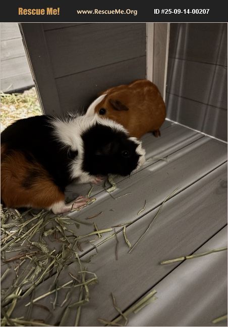 Rehoming my 2 Guinea Pigs. The orange one is a female named Hamtaro and the multi colored one is a male named Jeeves. Both come together and will come with fleece blankets, hideaways, hanging cots, and whatever food and treats are left when someone takes them in. Also they come with food bowls and water bottles, and 2 cloth hanging hay feeders.