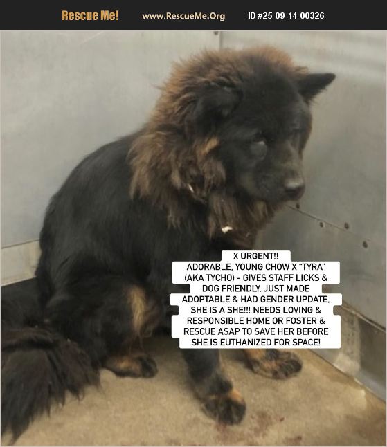 Courtesy Posting: X URGENT AT SAN BERNARDINO CITY SHELTER WHICH IS FULL - ADORABLE, YOUNG CHOW X 'TYRA' (a.k.a. TYCHO) ID #A583986 - GIVES STAFF LICKS & DOG FRIENDLY. Just made adoptable and had gender update, she is a she! AT SAN BERNARDINO CITY SHELTER - NEEDS LOVING AND RESPONSIBLE HOME OR FOSTER AND RESCUE ASAP TO SAVE HER BEFORE SHE IS EUTHANIZED FOR SPACE! Shelter describes as 'SWEET'. Help! The SBC shelter is full, and is sadly now dealing with a distemper outbreak so all dogs there get very little time. Both dogs have already been treated for earlier nasal discharge and placed on doxy on 8/27 for 14 days, and have since finished this and have no more medical noted at this time. Young Tyra was found as a stray, along with a friend, Berry, believed to be her sister. The shelter had mistakenly identified both as males where they were overlooked, and just updated their listing to be female. The girls can be adopted, fostered, rescued separately, although if anyone can take both, that's even better, but not required given saving one is better than none, and will allow the other one to hopefully also then find placement on her own. The two girls are currently kenneled together and thus believed to be dog friendly with others. Both dogs are estimated to be only 2 years old, weigh 60 lbs and have unique black and tan coloring and were originally Rescue only after being mislabeled initially as aggressive by the intake officer when were just scared. However, in their kennel, even early shelter notes indicated both dogs approached the kennel fence when staff approached, have a 'swishy' tail wag, with open mouth and a loose face. Tyra even licked staff, while Berry pressed her head to gate to solicit attention However, because they were reactive to the leash (from fear going over the head, likely from earlier being catch poled), both dogs had not yet been made adoptable until more recently. They can be seen in videos happily approaching the kennel fence. Shelter notes from 9/5 state 'Dog was wagging tail entire time, allowed petting on head', and from 9/13, the shelter told us, 'these sweet girls were sexed incorrectly on intake and were labelled as male. Upon being moved out to our general kennels, the error was noted and they were updated! I've attached their kennel cards for you. They are social with people and other dogs; their only concern is that they have no leash training and need to be carried. They are adoptable, and we would love for them to find placement with a rescue or adopter who has experience with the breed!' If you are interested in adopting Tyra and/or her friend and provide a forever home, please contact the shelter directly by calling (909) 998-4000 or using their listing links: Tyra: https://24Petconnect.com/DetailsMain/SBCT/A583986 Berry: https://24Petconnect.com/DetailsMain/SBCT/A583985 Or, if you are interested to foster or foster-to-adopt her or her friend, or just need more help, please contact [email protected] asap or Southern California Chow Chow Rescue Network who is trying to assist the shelter with her/their placement. Please notes rescue groups typically need a foster to save a dog. We will therefore try to pair you with a willing rescue group in time if you can foster. Rescues should contact San Bernardino City Animal Control at (909) 998-4000and also by email [email protected] asap and note the ID. We will also post additional pictures, video and updates on facebook at: Tyra: https://www.facebook.com/debbie.alder.14/posts/pfbid02vNKP9QPuWgj7fg8YTY5ZtLx5421oK5KVgDhvmSLuUfCQp2kymPKX5HxHJstY4jhyl Berry: https://www.facebook.com/debbie.alder.14/posts/pfbid02a1eUD8KK4y6HhKCBoEGMsSPgrroreUY2yrYWXeA2Y9LG91G7P7sYoUb5uVq7QyT4l Note: to view contents of links you will need to copy and paste each one separately into your browser.