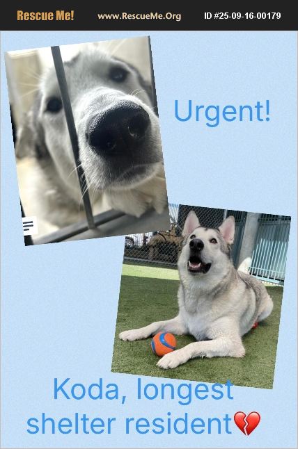 Koda, a handsome, sweet, young Husky who has been in the shelter for almost a year!!! Yes, a year!!! So heartbreaking!!! Due to being in the shelter for so long he's a prime candidate for EUTHANASIA!!! He's a volunteer favorite & he needs adopted or someone to foster him till he gets adopted!! Videos: https://fb.watch/C9ogrGe01K/?mibextid=wwXIfr&fs=e https://fb.watch/C9oOkwe1Dv/?mibextid=wwXIfr&fs=e https://fb.watch/C9oLgjzYWM/?mibextid=wwXIfr&fs=e 3-YEAR-OLD KODA NEEDS A FOREVER HOME!! AT SHELTER SINCE DECEMBER 2024!!!! Meet Koda! Koda was adopted from an LAAS shelter in 2023 and arrived at West Valley as a lost dog in December 2024. Sadly his owner never claimed him. He has become a volunteer favorite who LOVES to take a dip in the pool and occasionally plays with toys. He is VERY food motivated (he came back to West Valley 30 lbs heavier than when he left!). He has been in playgroup with other dogs several times and he is mostly chill and low energy but occasionally plays. Koda #A2078770, Neutered male, 3 years old, 95 lbs. Hours for adoptions: Tue-Fri 8am-5pm Sat-Sun 11am-5pm West Valley Animal Shelter 20655 Plummer Street Chatsworth, CA.
