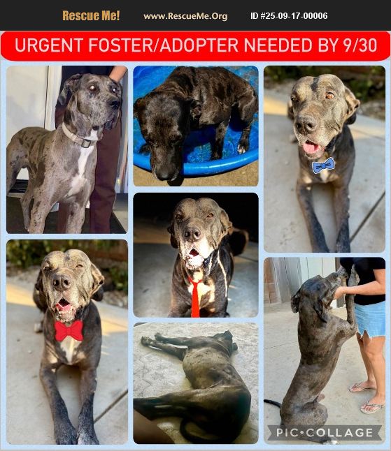 EXTREMELY URGENT: Odin Needs a Foster or Forever Home by 9/30! Video included. Odin's world has been turned upside down. After being a loyal, loving companion since he was just a cute 10-week-old puppy, his family is moving and leaving him behind. He's now 6 years old and facing heartbreak he doesn't understand. This gentle Merle Great Dane is the definition of a gentle giant- sweet, mellow, and affectionate. He is good with all dogs. He adores kids, is wonderful with people, and loves to lean his big body into you for cuddles. Odin is housebroken, good on a leash, and healthy. He doesn't deserve to lose everything he's ever known. His deadline is September 30th and without a foster or adopter, his future is in jeopardy. Please, don't let Odin's story end this way. He deserves a soft couch, a loving hand, and a family who won't give up on him. If you can foster or adopt Odin, please contact Jennifer with Pumpkin Pawz Rescue at (714) 366-8170. If you can't adopt or foster, please SHARE- you might be the reason Odin's forever family finds him. Sharing truly saves lives. Odin has so much love left to give. Let's not let him down!