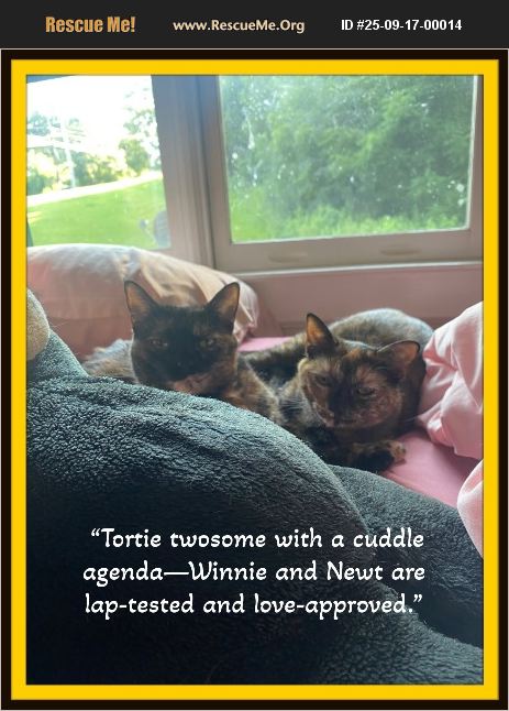 Meet Winnie & Newt - Tortie Sisters, Professional Cuddlers, Part-Time Comedians We come with purrs, sass, and a strong opinion about window seats. Hi there! We're Winnie and Newt, a bonded pair of tortoiseshell sisters with silky fur, golden eyes, and a shared mission: to take over your lap, your heart, and possibly your bed. We've never spent a day apart, and we plan to keep it that way-so if you're looking for a dynamic duo with charm, manners, and a sprinkle of mischief, you've found us. Our Resume Includes: - Polite Lap Invasion: We ask nicely before sitting on you. We're basically furry little ladies with excellent etiquette. - Cuddle Therapy: Feeling stressed? We'll purr, knead biscuits, and listen to your work drama like seasoned therapists. - Fashion Models (Reluctantly): Our foster mom dresses us up. Newt's chill about it. Winnie's like, 'I'll allow this for one photo, then I'm out.' - Window Seat Engineers: We watched our foster mom open a gate once. Now we do it ourselves. She called us 'little stinkers.' We took it as a compliment. - Bedtime Buddies: We'll join you in bed, curl up by your feet, and snore softly while dreaming of squirrels. Our Favorite Shows: - Nature TV (aka the window) - Birds Gone Wild - Squirrel Olympics We chirp, we stare, we get wide-eyed. It's very dramatic. Hobbies Include: - Wrestling each other like WWE stars (but cuter) - Playing with catnip toys and tiny balls - Looking fabulous in tortie fur - Supervising your every move with judgmental love Our Ideal Home: We'd love a quiet place with older kids (10+), or a single/retired human who appreciates the finer things-like brushing us, admiring our beauty, and sharing snacks (okay, maybe not snacks, but we'll stare at them lovingly). Adoption Details: - Age: 16 months - Spayed, vaccinated, _ Micro-chipped - Free lifetime subscription ($199 value) included by adopting from Rusty's Tales - No bad habits-unless you count gate-hacking - Bonus: Hanes Mall Pets Supplies Plus gives you 15% off everything for adopting us. That's right-we come with perks. - Labor Day Special - Adopt Fee $150 each, adopt by 9/31/25, take $125 OFF!!! Ready to Be Our Person? Apply online at Rusty's Tales Rescue Apply here: apply at https://rustystalesrescue.com/adoption-application. We're ready to bring the sass, the snuggles, and the tortie magic. Love, Winnie & Newt (aka The Cuddle Committee)