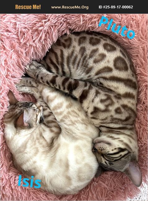We are looking for the right family to adopt our two beautiful Bengal cats. I originally adopted them from a military family that received orders to Hawaii (where Bengals aren't permitted). I had hoped they would blend in with our Bengal, but despite months of trying everything (including neutering the male), they simply aren't adjusting well with her. �Ϭ Meet Isis �'ۢ Lynx Point Bengal �'ۢ Birthday: 3/4/24 �'ۢ Spayed �'ۢ Colors: blues, light creams, and tan with striking blue eyes �'ۢ Petite, shy at first but very loving once comfortable �'ۢ Curious and playful, enjoys exploring quietly �Ϭ Meet Pluto �'ۢ Seal Point Bengal �'ۢ Birthday: 5/1/24 �'ۢ Neutered, microchipped �'ۢ Silver and black markings with bold green eyes �'ۢ Extremely social, loves people and attention �'ۢ Playful, energetic, and also enjoys relaxing naps �Ϭ About Them Together �'ۢ Half siblings, bonded, both under 2 years old �'ۢ Fixed and up to date on shots �'ۢ Healthy, playful, and loving (he is more social, she is more reserved but sweet) �'ۢ Some people find Bengals to be hypoallergenic-my mom and sister (both allergic) haven't had issues, but of course, that can vary �'ۢ I've never seen them have hairballs �Ϭ Best Home Fit �'ۢ A family with no other cats �'ۢ Great with kids 5th grade and older �'ۢ Do fine with dogs (we have two large dogs, 110 & 70 lbs, and they've been fine) �Ϭ Extras Included They will come with their vet records, baby photos, toys, litter box, and other supplies to make their transition easier. These two deserve a calm, happy home where they can thrive together. They are truly amazing cats; this decision comes after trying everything possible, and it's what's best for them. If you're interested or have any questions, please feel free to message me. ����