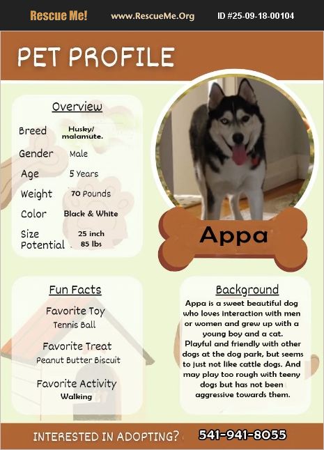 Appa is a sweet beautiful dog who loves interaction with men or women and grew up with a young boy and a cat. Playful and friendly with other dogs at the dog park, but seems to just not like cattle dogs. And may play too rough with teeny dogs but has not been aggressive towards them.