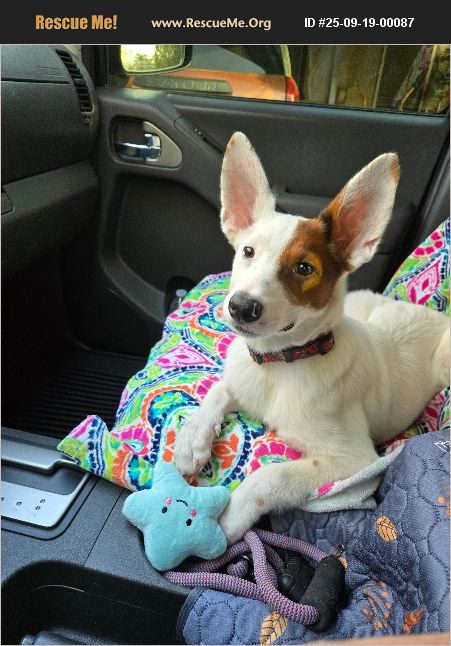 Biscuit is a male, 5 month old Jack Russell/ Cattle Dog mix (our best guess). He is mostly white with brown and black spots and a brown patch over his left eye. He has large, brown spotted, pricked ears and a black nose. He has a black spotted belly. He is a small dog weighing about 16lb. We found him wandering in a rural area. He was scared, dirty, and hungry but approached us immediately without fear and was wagging his tail. He is up to date on all vaccinations and has been micro chipped. He has not been neutered. He is house trained and uses a dog door with 24 hour access to both indoors and a backyard with no issues. Biscuit has a wonderful temperament and is good with people, very energetic, affectionate, and playful. He does not have any food or toy insecurities and has shown no signs of aggression to anyone he's been in contact with. He is not leash trained yet and it is unknown if he is good with other animals, but he is very smart and learns quickly.