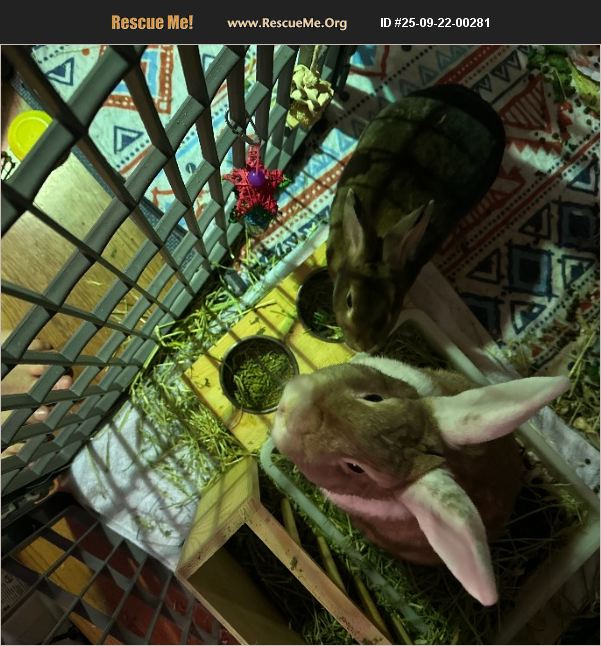 Two bonded female spayed Mini Rex(Brown) and Mini Rex/Holland Lop mix (Orange and white). The brown bun is Artemis and the other is Butterscotch. They share the same mother. They have been inside for the past 6 months but have lived outside before that.