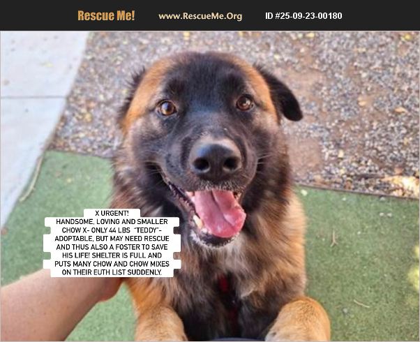 Courtesy Posting: X URGENT at PHOENIX, AZ- ID #A5150634 - MARICOPA COUNTY ANIMAL CARE (WEST VALLEY) - HANDSOME, LOVING AND SMALLER CHOW X- only 44 lbs 'TEDDY'- ADOPTABLE, BUT MAY NEED RESCUE AND THUS ALSO A FOSTER TO SAVE HIS LIFE! SHELTER IS FULL and puts many chow and chow mixes on their euth list suddenly. Please help us find a good home or foster and rescue for this young, friendly boy who was found as stray and said to be roaming the area with another dog. The shelter has named him Teddy and listed as a chow mix and estimates he is 4 years young. At only 44 lbs, he is perfectly size. Sadly, his owner never showed though. At the shelter, Teddy is described as, 'Solicited attentions, Easy to pull from kennel, Easy to return to kennel, Takes treats nicely, Easy/Loose Leash, Calm, Ignored dogs when walking past kennels, In yard came right over to me, put paws on my lap. Allowed me to pet him which eventually became hugging him. LOVED it & kept returning for more. He is friendly, loving, calm, quiet, cooperative, gentle, respectful, and a kisser. love him! Soft body at front of kennel, slightly head shy of leash but quickly warmed to handler and allowed it. Walked with light pull. Affiliative and attention seeking in yard. Allowed all petting; put front feet in handler's lap for attention. Interacted well and calmly with kennelmate. No issues on return. Removed leash by hand.' For a copy of full behavior and medical notes, though, please go to: https://apps.pets.maricopa.gov/adoptPets/Home/Details/A5150634 The dog he was found with is A5150636, although he or she is no longer listed. Teddy is now adoptable, but is likely on borrowed time in a full shelter. If you may be interested in adopting, please contact the shelter immediately and directly at (602) 506-7387, ask for him by ID. Adoptions are currently only $50 currently. This includes spay/neuter surgery, vaccinations, and microchip. Teddy was already neutered at the shelter so he is ready to go home! Please note we are looking also looking for foster in case he does need rescue. If you are interested in fostering, fostering-to-adopt, or helping in some other way (ie., pledging for his rescue), please also contact [email protected] asap or Southern California Chow Chow Rescue Network who is trying to find placement. We will try to pair fosters or interested parties with a rescue group. Rescue groups may contact the shelter directly at [email protected] and by calling 602-506-7387 and providing the ID. We will be posting videos, additional pictures and updates on facebook here: https://www.facebook.com/permalink.php?story_fbid=pfbid0FMi2276MNsiS3Le2tib47p9ngoKrvMo5rEcK8yTM2wsSfGcjHx1ykHC27376JN67l&id=100064927891266 Note: to view contents of links you will need to copy and paste each one separately into your browser.
