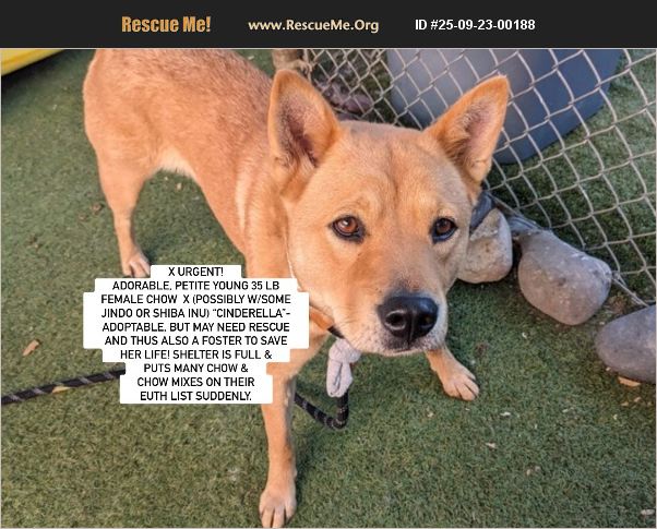 Courtesy Posting: X URGENT at PHOENIX, AZ- ID #A5150886- MARICOPA COUNTY ANIMAL CARE (WEST VALLEY) - ADORABLE, PETITE YOUNG 35 lb FEMALE CHOW X (possibly with some jindo or shiba inu) 'CINDERELLA'- ADOPTABLE, BUT MAY NEED RESCUE AND THUS ALSO A FOSTER TO SAVE HER LIFE! SHELTER IS FULL and puts many chow and chow mixes on their euth list suddenly. Please help us find a good home or foster and rescue for this adorable, little young girl who was found as stray and her owner sadly never showed. The shelter has named her Cinderella and she resembles a chow jindo mix. The shelter listed her as a 2 year old chow mix. At only 35 lbs, Cinderella is perfectly size. She is now adoptable, but likely is on borrowed time. The shelter notes describe Cinderella as 'standing near front of kennel, gentle wagging tail, soft face. Became more wiggly as handler was opening gate. Dog was initially a little head-shy of leash but allowed placement without issue. Needed some encouragement to exit kennel as neighboring dog was at gate, barking. Once out of kennel, dog walked with a moderate pace, loose leash, occasionally slowing or stopping, needing some coaxing. In yard, dog explored with loose body language, tail down, neutral. Would allow handler to approach and pet when going slowly. Easily startled. Handler walked dog to main building; dog appeared cautious but continued with coaxing. Entered new life room without issue. Allowed handler to remove leash by hand and then step out.' Cinderella is shy at first so Shelter additional notes state, 'need socialization, leash work, go slow, experienced handler, no cats, and children 12+.' For a copy of full behavior and medical notes, though, please go to: https://apps.pets.maricopa.gov/adoptPets/Home/Details/A5150886 If you may be interested in adopting, please contact the shelter immediately and directly at (602) 506-7387, ask for her by ID. Adoptions are currently only $50 currently. This includes spay/neuter surgery, vaccinations, and microchip. She is already spayed and ready to go home. Please note we are looking also looking for foster in case she does need rescue. If you are interested in fostering, fostering-to-adopt, or helping in some other way (ie., pledging for her rescue), please also contact [email protected] asap or Southern California Chow Chow Rescue Network who is trying to find placement. We will try to pair fosters or interested parties with a rescue group. Rescue groups may contact the shelter directly at [email protected] and by calling 602-506-7387 and providing the ID. We will be posting videos, additional pictures and updates on facebook here: https://www.facebook.com/debbie.alder.14/posts/pfbid02hxJLfZpoAmuZdYS1CDtcnfbvaL9Ghhm6hD8EHqqtZGCjxPR1XZ8x6KzpZAh7Sensl Note: to view contents of links you will need to copy and paste each one separately into your browser.