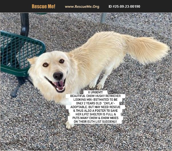 Courtesy Posting: X URGENT at MESA, AZ- ID #A5150648 - MARICOPA COUNTY ANIMAL CARE (EAST VALLEY) -BEAUTIFUL CHOW HUSKY RETRIEVER LOOKING MIX- estimated to be only 2 years old 'ZAYLA'- ADOPTABLE, BUT MAY NEED RESCUE AND THUS ALSO A FOSTER TO SAVE HER LIFE! SHELTER IS FULL and puts many chow and chow mixes on their euth list suddenly. Please help us find a good home or foster and rescue for this young, pretty girl who was found as stray at a park and and her owner sadly never showed. The shelter has named her Zayla and listed her as a 2 year old chow husky mix, although we think she looks like she could also have some retriever in her with her beautiful coat. She weighs 56 lbs. Although Zayla was a little shy when found and had to be carried, more recent shelter notes describe her warming up and easy to handle and state, 'Easy to pull from kennel, Easy to return to kennel, Ignored dogs when walking past kennels. soft body, loose wagging tail, light pant, handler fed dog treats through kennel door and dog ate gently, when handler went to unlock door, dog slowly retreated to outside portion of kennel, handler closed guillotine behind dog and went around to pull from back, on re approach, dog was up with two front paws on the kennel door, continued soft body, handler went to crack open door and presented leash loop, dog jumped down and placed nose to the crack of the door, handler was able to leash dog and dog walked out of kennel, dog pulled to nearest bush with low body and pancaked under bush but continued to walk with low body towards yard, handler sat at bench and dog would come up to handler and solicit pets, allowing petting all over and leaning in for more, dog took treats gently, dog jumped up on handlers lap for more pets and continued soft body with a light pant.' Zayla is now adoptable, but likely on borrowed time and needs out asap since she has come down with some nasal and ocular discharge and was placed on doxy on 9/19. A Complete list of behavior and medical notes can be found here: https://apps.pets.maricopa.gov/adoptPets/Home/Details/A5150648 If you may be interested in adopting, please contact the shelter immediately and directly at (602) 506-7387, ask for her by ID. Adoptions are currently only $50 currently. This includes spay/neuter surgery, vaccinations, and microchip. Please note we are looking also looking for foster in case she does need rescue. If you are interested in fostering, fostering-to-adopt, or helping in some other way (ie., pledging for her rescue), please also contact [email protected] asap or Southern California Chow Chow Rescue Network who is trying to find placement. We will try to pair fosters or interested parties with a rescue group. Rescue groups may contact the shelter directly at [email protected] and by calling 602-506-7387 and providing the ID. We will be posting videos, additional pictures and updates on facebook here: https://www.facebook.com/debbie.alder.14/posts/pfbid02cPUTfFBu4qra2Qcxu4uxdzD28PE1hURSMfGPzN56xs6zL6gtSZ3AJwtWmTTAbBrPl Note: to view contents of links you will need to copy and paste each one separately into your browser.