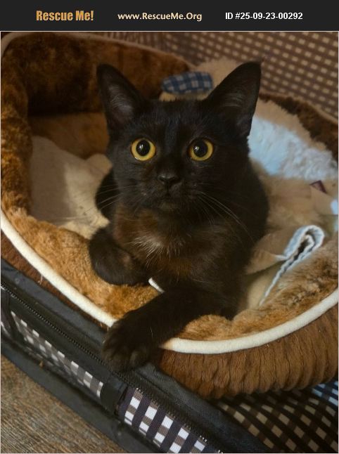 I rescued this tiny, starving, stray black kitten from a church parking lot on 8/30/25. She appeared to be 6 weeks old. The no-kill shelter's cat room was closed due to an outbreak; so, I brought her home. The first order of business was to feed this wee thing. On 9/12/25, I brought her to a local veterinary clinic to be examined. She received her first series of vaccinations and rabies vaccine, was tested for FeLV/FIV/HW (all negative), and treated for an URI. The shocking news is that this kitten is actually 6 months old! Starvation stunted her growth. She is just 8' tall at the shoulder and about 11' from base of tail to base of neck. No doubt she'll grow some more. Other than being extra small, she's normal. Ember has a robust appetite and enjoys playing. She's been quarantined from my 3 cats, so I don't know how compatible she'd be with other cats, though I'm certain she'd love to have a playmate; I don't have a dog so can't comment on compatibility. She has been fine around other people. She is a sweet little munchkin who needs a loving home where she can be an indoor-only cat (firm requirement). The adoption fee covers her wellness exam and vaccinations. She still needs to be spayed. More photos available on request.
