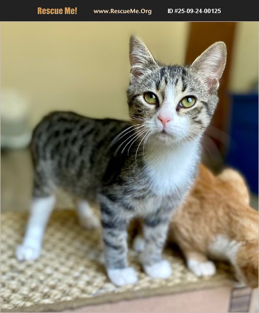 Oberlin is a sweet tabby kitten (with white mittens) who is looking for a loving home. This little guy has managed to quickly charm everyone who meets him. Oberlin is a talkative little boy who is in equal parts intrepid explorer who will help you discover all the nooks and crannies in your home, and a lover of cuddles. A purr-fect personality! As he is still quite young, Oberlin will need a forever home with at least one other young cat to have as a playmate. If you don't already have a play-buddy, Oberlin is living with several playmates who would be excellent and adorable options. (Just ask for options.) He is particularly close to Orzo (his brother) but gets along well with everyone. Oberlin enjoys all people and plays well with children. He has not had a chance for any playtime with dogs, but we expect that she would do well with one who is kitten-friendly. Oberlin is up-to-date on his vaccinations and has been neutered. He is litter box trained and has been well socialized people and cats (in addition to his littermates). He is a healthy and happy kitten who is looking forward to meeting you! To meet Oberlin and other adoptable Purr Partners kitties at one of our weekend adoptathon events, 1) review our adoption policies at https://www.purrpartners.org/adopt/policies/ and 2) then apply to become a pre-approved adopter at https://www.purrpartners.org/adopt/cats/