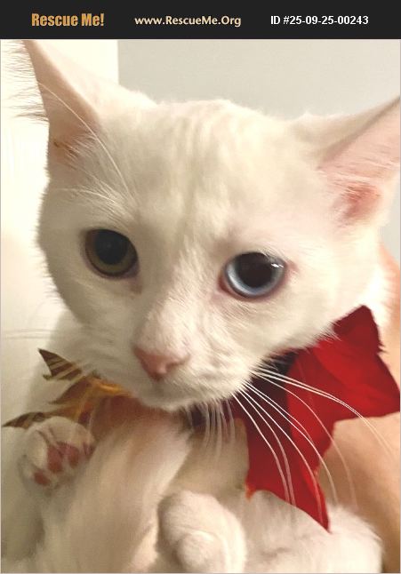 Meet Spirit of the 'Halloween Trio!' She came to us after being found as a stray along with her brothers, Boo and Ghost! These four-month-old all-white sweethearts are now ready for the next chapter of their story-a loving furever home. Spirit is the tiniest and shyest of our Halloween kittens. She has a magical charm all her own-one captivating green eye and one striking blue eye! Though she's a little more reserved than her brothers, this petite beauty has the sweetest disposition. Spirit enjoys gentle play and quiet moments, and with patience, her personality will shine through. She is looking for a family who will give her the love and reassurance she needs to feel safe and adored. Spirit is good with other cats and is also in foster with a dog, however she is afraid of the pup. She must be adopted to a home with one of her littermates or another kitty. Her adoption fee is $250 and Spirit is vaccinated, FIV/FELV negative, microchipped, and will be spayed in October. If you're interested in this cutie, please fill out an application at https://form.jotform.com/201805462692153. For questions, email [email protected].