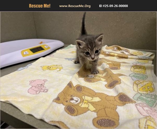 I am described as a female, gray tabby Domestic Shorthair mix. The shelter thinks I am about 4 weeks old. I weigh approximately 0.76 lbs. I have been at the shelter since Sep 25, 2025 and I may be available for adoption on Sep 25, 2025 at 3:27PM.