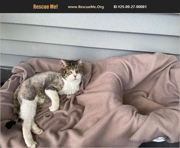 very sweet and affectionate small adult cat. Indoor/Outdoor. going to been seen for eye irritation and digestive issues. she is coming from being hoarded in a basement for most of her life along with 19 other cats. She was shaved to remove the hair masses all over her body. She is a white cat with light color stripes.