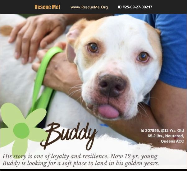 Buddy IS OUT OF TIME!! Need a HERO NOW! There is a rescue that wants to help but they need a foster or adopter TO BE EUTHANIZED 9/28/25 IN NYC A Volunteer writes: 'Buddy 12 is no age to find yourself in a shelter. Buddy should in a home, on an orthopedic bed, being cherished and loved on in his golden years. And it seems he had a loving home for the last several years, until financial hardship and a difficult no pet policy took it all away from him. I saw Buddy this past weekend, enjoying the rare space of a double kennel run. I paused to watch him napping on his sunny bed peacefully. He caught me and came over to say hi, wagging his tail the whole way over. I gave him all my extra treats, but Buddy deserves more than a few walks a day and stray treats from my pouch. He deserves everything. As our kennels begin to fill back up, the extra space he had has already been taken up by another dog in need. He's 77lbs, his ID is #207855, and he is waiting at Queens ACC.' THE VOLUNTEERS MADE BUDDY THIS VERY SWEET REEL. PLEASE TAKE A LOOK AT WHAT A GOOD BOY HE IS. https://www.facebook.com/share/r/1EU29Z9ZZ8/ Meet Buddy! This absolutely amazing, sweet 12 year young senior hopes you will give him his dream retirement home. Level 2 behavior rated!!!! Surrendered after 2 years with his caretaker, Buddy came to us when his person could no longer provide for his needs due to financial hardship and housing restrictions. His story is one of loyalty and resilience - he was originally left in her care by a friend who never returned and she did everything she could to keep him safe and fed, even amid eviction threats. Now 12 years young, Buddy is looking for a soft place to land for his golden years. My Ideal Home Buddy would do best with a patient, adult household that understands the needs of a senior dog. He enjoys peace and quiet, familiar routines, and the occasional peanut butter treat. A home with gentle structure, soft bedding and a human who respects his boundaries would be perfect. Good with Kids? Buddy should go to a home without young children (under age 13) as he prefers interactions on his own terms and needs a calm, understanding environment. Good with other pets? In his previous home, Buddy was tolerant of familiar dogs but preferred slow introductions. He recently met a female dog here at the shelter and politely sniffed before walking away - he's not looking for a playmate, but might do well with another mellow companion. He has no experience with cats. Leash Manners While Buddy can be strong on leash and is sometimes reactive to moving objects (barking or growling), he is manageable with experienced handlers. He benefits from calm, structured walks and might enjoy short strolls in quieter neighborhoods. Behavior determination: Level 2 Buddy is a sweet, older gentleman who has done well in our care center. He leans into pets, seeks out affection, and knows many cues like 'sit,' 'go to your bed,' and even 'give me a hug!' He is crate trained and housetrained, though may need reminders in a new space. His known challenges include mild resource guarding, leash reactivity and general anxiety - but with the right person, we believe Buddy would thrive. FUN FACTS! Favorite food: Purina with rotisserie chicken and eggs Favorite treat: Peanut butter! Enjoys lounging in the living room and quiet companionship. Knows multiple commands and loves praise from his humans.