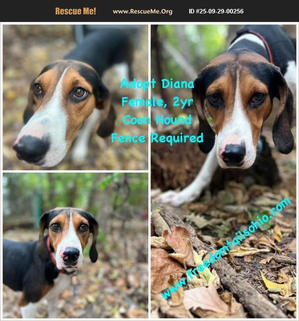 Adopt Diana Coon Hound Female, spayed Approx 2 yrs Approx 50lbs Fence required Diana is estimated to be 2 years old, she gives off young vibes. She is friendly, sweet, curious, and energetic, she also loves to chill out and cuddle. She is great with kids, loves to be near the other dogs, and is not bothered by the cats. She is housebroken and respectful of the home. She keeps to the dog toys and bones, but might steal the occasional sock. She is still learning to not pull while on the leash. She is vaccinated and spayed. Her short coat is a breeze to maintain. If you're looking for a wonderful addition to your home, please apply at freedomtailsohio.com.
