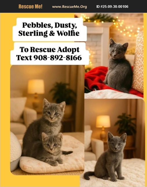 Urgent! Save Rescue Kittens!! NOW AVAILABLE FOR ADOPTION! Pebbles, Sterling, Dusty and Wolfie are available for adoption! These adorable siblings can be adopted separately or together! To Rescue Adopt please Text Message 908-892-8166