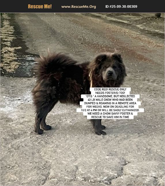 Courtesy Posting: EMERGENCY!!! CODE RED AT WOODLAND, CA IN N CAL (NW of SACRAMENTO)- Yolo County Animal Services - ID #A218116 - RESCUE ONLY - NEEDS FOSTER(s) TOO - 'OTIS ' a handsome, but neglected 43 lb male chow who had been dumped and roaming ina remote area for weeks NOW ON DEADLINE FOR 10/6 AT 4 PM OR WILL BE SADLY EUTHANIZED. WE NEED A CHOW SAVVY FOSTER AND RESCUE TO SAVE HIM IN TIME. Emergency/soon to be euthanized! We are in urgent need of finding a chow or similar breed savvy foster and rescue to save poor Otis. Per the Yolo shelter who reached out for help. they said, ' Otis found his way to our shelter after running loose for almost 3 weeks. Otis, being very clever, eluded our animal services officers on numerous occasions, ignoring our efforts in placing dog traps and was finally captured via the use of tranquilization.' We understand from those originally contacted, 'People who saw him roaming for a while said he was friendly with them and their dogs.' The shelter also stated 'Since intake, Otis is very fearful, growls and barks at staff passing by his kennel. Otis will run up to the kennel, and growl/bark when attempting to offer treats. Otis requires either handling via catch pole or being walked through, using metal gates, to an adjacent kennel. Otis cannot safely be handled by staff or DVM staff. We have not been able to age Otis, although we can tell he is an adult. Otis came to our shelter in a very matted condition, poorly kept condition. Otis has been placed on Gabapentin and Trazodone in efforts to aid his anxiety. Otis is in need of a Chow savvy rescue group to help him feel at ease. If you can help Otis, please let us know by 4pm on 10/02/2025.' Since then, however, Otis has had improved behavior as seen in videos sent 10/2, and the shelter has given an extension to 10/6 at 4 pm. We will post these videos on Facebook. You can also see how badly he he is matted and was clearly neglected. This poor boy deserves a chance at life and love. If there is a savvy foster who may be able to help, or anyone local who can go visit him, or can help in any other way, please email: [email protected] asap at Southern California Chow Chow Rescue Network asap who is trying to find placement asap before he is killed. Rescues will be able to assist with neuter and vetting. Rescue groups should also contact the shelter directly via email at: [email protected] and call (530) 668-5287, ask for Officer Frame. Otis's facebook post with updates, additional pictures and videos is: https://m.facebook.com/story.php?story_fbid=10167848895988125&id=783968124&mibextid=wwXIfr Note: to view contents of links you will need to copy and paste each one separately into your browser