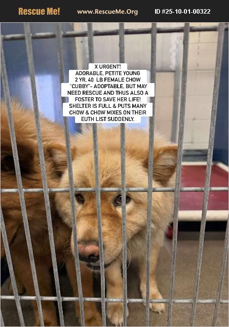 Courtesy Posting: X URGENT at PHOENIX, AZ- ID #A5151899 - MARICOPA COUNTY ANIMAL CARE (WEST VALLEY) - ADORABLE, PETITE YOUNG 2 YR, 40 lb FEMALE CHOW 'CUBBY'- ADOPTABLE, BUT MAY NEED RESCUE AND THUS ALSO A FOSTER TO SAVE HER LIFE! SHELTER IS FULL and puts many chow and chow mixes on their euth list suddenly. Please help us find a good home or foster and rescue for this adorable, little young girl who was found as stray with a similar looking friend (possibly her sibling) who also needs a good home or foster and rescue. A finder saw both dogs running in the street and were able to lure them to their home overnight. The finder reported both dogs allowed petting and handling and appeared to be very friendly towards one another. They were brought to the Maricopa shelter in hopes of being reunited with their owner, but no one sadly showed up. Both dogs are kenneled together and are adoptable, either separately or together. This girl has been fondly named 'Cubby' due to looking like a lion cub coloring, and her friend has a darker red coat and has been named 'Ginger Spice'. We have a separate post up for her as well. At only 40 lbs, Cubby is perfectly sized, along with her friend, and both are estimated to be only 2 years old. Additionally, the dogs have wonderful behavior notes at the shelter, and Cubby is noted as: '09/30/2025 No issue separating from kennel mate. Dog approached handler at front of kennel with wagging tail, soft body, accepted treats gently through gate. Jumped on kennel door with wagging tail as leash was presented, allowed for easy leashing. Walked with easy leash pull to play yard, sniffed some kennels but no reactivity observed. Easy to direct to play yard. In yard dog had soft body exploring, would have wagging tail when called over, accepted pets if near handler. Would go potty, explore yard some more, and solicit attentions with handlers with soft body. Sweet dog. No issue retrieving leash. Walked back to kennel with easy leash pull. Walked right into kennel on own. No issue retrieving leash through long hair by hand.' A full copy of both behavior and medical notes can be found here: https://apps.pets.maricopa.gov/adoptPets/Home/Details/A5151899 (Cubby) https://apps.pets.maricopa.gov/adoptPets/Home/Details/A5151895 (Ginger Spice) If you may be interested in adopting one or both, please contact the shelter immediately and directly at (602) 506-7387, ask for her/them by ID. Adoptions are currently only $50 currently. This includes spay/neuter surgery, vaccinations, and microchip. Cubby's listing link is https://24Petconnect.com/DetailsMain/MRCP4/A5151899 Ginger Spice's listing link is: https://24petconnect.com/DetailsMain/MRCP/A5151895 Please note we are looking also looking for foster in case she and or her friend does need rescue. If you are therefore interested in fostering, fostering-to-adopt, or helping in some other way (ie., pledging for her/their rescue), please also contact [email protected] asap or Southern California Chow Chow Rescue Network who is trying to find placement. We will try to pair fosters or interested parties with a rescue group. Rescue groups may contact the shelter directly at [email protected] and by calling 602-506-7387 and providing the ID. We will be posting videos, additional pictures and updates for Cubby on facebook here: https://m.facebook.com/story.php?story_fbid=10167838363608125&id=783968124&mibextid=wwXIfr Facebook post for Ginger Spice: https://m.facebook.com/story.php?story_fbid=10167838331398125&id=783968124&mibextid=wwXIfr Note: to view contents of links you will need to copy and paste each one separately into your browser.