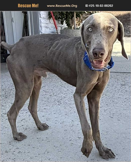 cut and paste www.socalweimrescue.org/pages/adopt Dylan is only a year old and was found running the streets with his 6 month old brother Declan and littermate Dallas (we assume). They survived being on the streets together for 10 days that we are aware of. When finally contained they were turned over to us because finders wanted to have a good adopter help them. That would be YOU! Can you help one of these boys? They are scheduled to be neutered on October 17th after we can put a little weight back on them. We are pretty sure all three boys were outside dogs. They will all need a lot of love, patience and training to get them used to your routine. Crate training is a life saver and will make house training a breeze. We won't lie, they will require a bit of work. Every Weim that is saved from horrible conditions ends up being the very best faithful companion. Won't you dig deep inside your heart and help one of the hopeless? We will update as we work with them and as they gain a little weight to have their surgery. We'd love to have you meet them before that so we can know they will have a home to go to. They deserve so much! Currently they are fostered in the North LA County Area in Nenach. Well worth the drive!