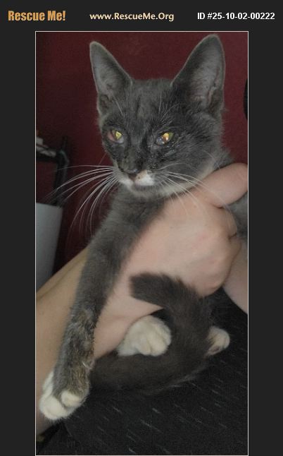 This animal is available to licensed rescue groups only. Please do not enquire unless with a licensed rescue group. 8-10 weeks old Current Upper Respiratory Infection. ***Female cat in neighborhood had three kittens. Two were adopted by neighbor. Vet appt soon for meds. Named James Bond because he is brave (jumping off counters, climbing, sneaking around).