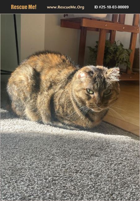 Scrunchy is a real sweet and cute cat. She got her name from her ears that are slightly 'scrunchy' looking, but she's a very pretty kitty. She loves to cuddle and is very affectionate. She was quite skiddish around our dog for the first few days, but now she is completely unbothered by him. Unfortunately we have really bad allergies and can no longer live with cats. She does have a brother cat that she's bonded with if you're interested in taking two great cats.