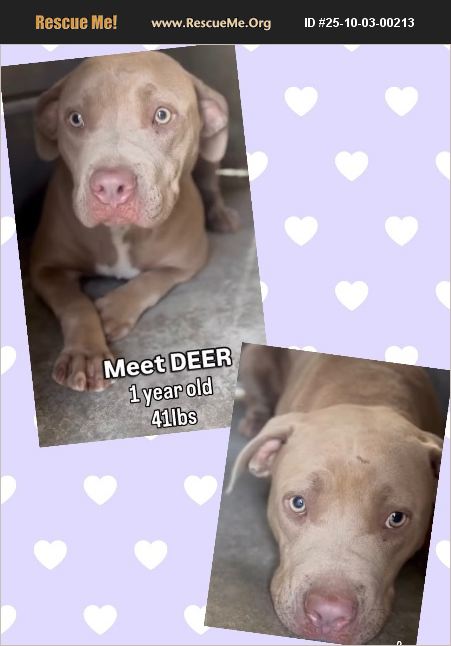 Deer, A2221541, is in a high kill shelter & needs saving before she is euthanized!!! Video: https://fb.watch/CvXLJ4LIAS/?mibextid=wwXIfr&fs=e Holy moly is this girl adorable!!!Young Deer was surrendered North Central because her people had too many animals in their care. She's a happy, wiggly, playful puppy and we absolutely love her. She's only 1 year old and a petite 40 lbs. Let's get this cutie seen! If you can foster, please fill out a foster form! Deer #A2221541 is also available for adoption directly from: North Central Shelter 3201 Lacy St, Los Angeles.