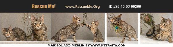 Merlin and Marisol are an adorable pair of sweet, friendly, playful and loving, five-month-old, male and female, brown tabby kittens looking for a loving guardian. Marisol is female with golden eyes; Merlin is male with hazel eyes. These siblings can be adopted together, or each to a home with another feline friend. They also both get along with cat-friendly dogs. They are very well-behaved in the home, use their litter box faithfully, and love jumping for a cat dancer, or rolling a ball! They are living in the most amazing foster home with fabulous humans, dogs and cats that have included them in the fold of the household. Merlin and Marisol are extremely healthy, de-wormed, de-flead, neutered and spayed, virus-tested negative, microchipped, and vaccinated for rabies and distemper. To meet and possibly adopt Merlin and/or Marisol, please fill out an adoption application https://friendsofpetraits.com/cat-adoption-application/ After the application is complete, please contact [email protected] to schedule an appointment to meet them. Their adoption fee of $175 each, or $300 as a pair, benefits the Friends of Petraits Rescue. They are currently being fostered in Barrington, Illinois.