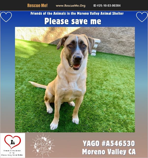 YAGO - ID#A546530 Shelter staff named me YAGO and I am a male, tan and white Shepherd mix. The shelter thinks I am about 1 year. I weigh approximately 76.00 lbs. I have been at the shelter since Oct 01, 2025 and I may be available for adoption on Oct 09, 2025 at 10:00AM.