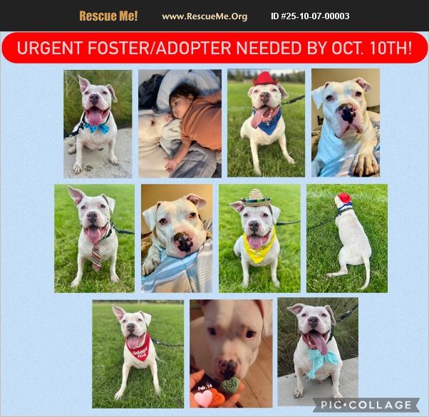 URGENT! Video included. Jack Frost Needs a Foster or Adopter by October 10th! Jack Frost is a 6-year-old white pitbull whose whole world has just been turned upside down. His mom has loved him since he was just 8 weeks old, but after hitting hard times, she and Jack are now living in her car. Jack is her best friend and lifeline. She has a job, but she can't leave Jack in the car while she works. She's done everything she can- leaving him with friends and relatives while she worked but has run out of options. The only place left is the shelter, where overcrowding means Jack will almost certainly not make it out alive. His mom's life is already hard enough without the crushing fear of knowing that her best friend didn't make it out alive. That's where Pumpkin Pawz Rescue wants to step in and help this little family. But we need YOU. About Jack Frost: 6 years old. Neutered & up to date on vaccines. Housebroken & mellow. Loves children and people. Needs to be the only dog in the home. Snuggly, loves walks & watching TV. Big fan of pup cups from Starbucks. Jack is sweet, mellow and just wants to love and be loved. If you can foster, adopt, or know someone who can, please reach out to Jennifer at Pumpkin Pawz Rescue: +1 (714) 366-8170 If you can't take Jack yourself, please share his story far and wide. The right person is out there- help us find them before it's too late.