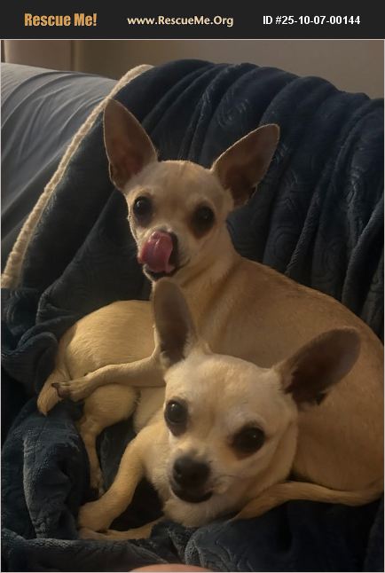 Chihuahua siblings, girls 2.5 years old. Super sweet, can go preferred together or separate. They need an owner that is at home alot, which I am no longer able to do. One weighs 4.5 and other 6.5. Will need to discuss situation they are going into.