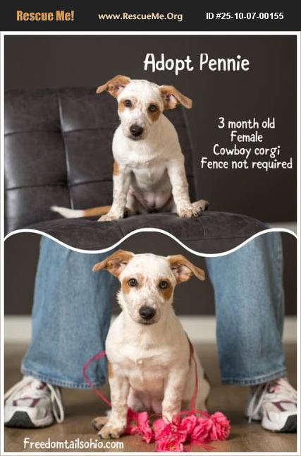 Adopt Pennie Your Future Cowboy Corgi! ��%90%BE Penelope 'Pennie', a sweet 14-week-old Corgi and Blue Heeler mix with a heart as big as Texas! Quick Facts: �'ۢ Age: 3 months �'ۢ Weight: 10 lbs �'ۢ Walks wonderfully on a leash �'ۢ Potty training in progress - can hold it all night �'ۢ Sleeps through the night after a little bedtime loving �'ۢ Plays well with small dogs, and big dogs �'ۢ Cat status: Not tested �'ۢ Great with kids �'ۢ No fenced yard required �'ۢ A+ Highly intelligent! Can sit/stay on command, easily learns! Treat motivated. She loves people and follows you everywhere - she's a true cuddle bug! Whether it's snuggling on the couch or soaking up attention, Pennie's chill, loving personality makes her the perfect addition to any home. She is truly grateful just to be around people - and her zoomies are epic! Ready to bring this little cowboy corgi into your heart (and home)? Pennie is waiting for you! Apply at freedomtailsohio.com